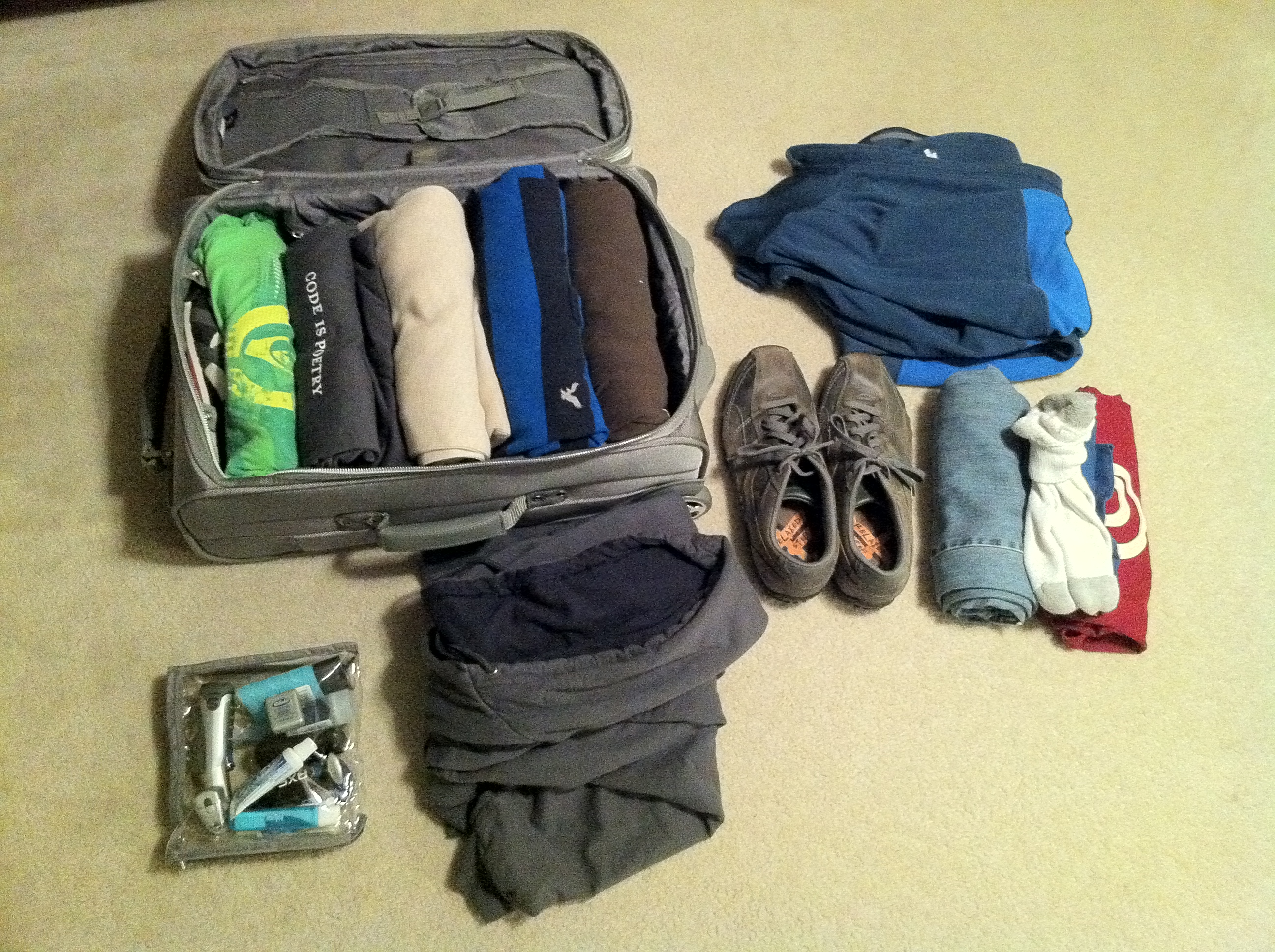This is the first time I’ve rolled my clothes (I forgot to roll the hoodie though). It actually works. If I had tried to pack those items my normally it wouldn’t have fit. I even had spare room. I really could have cut a few of the items off the list if it had been a tight fit. I also have room in my laptop bag in case I think of something I missed or if I want to bring something home from the trip.