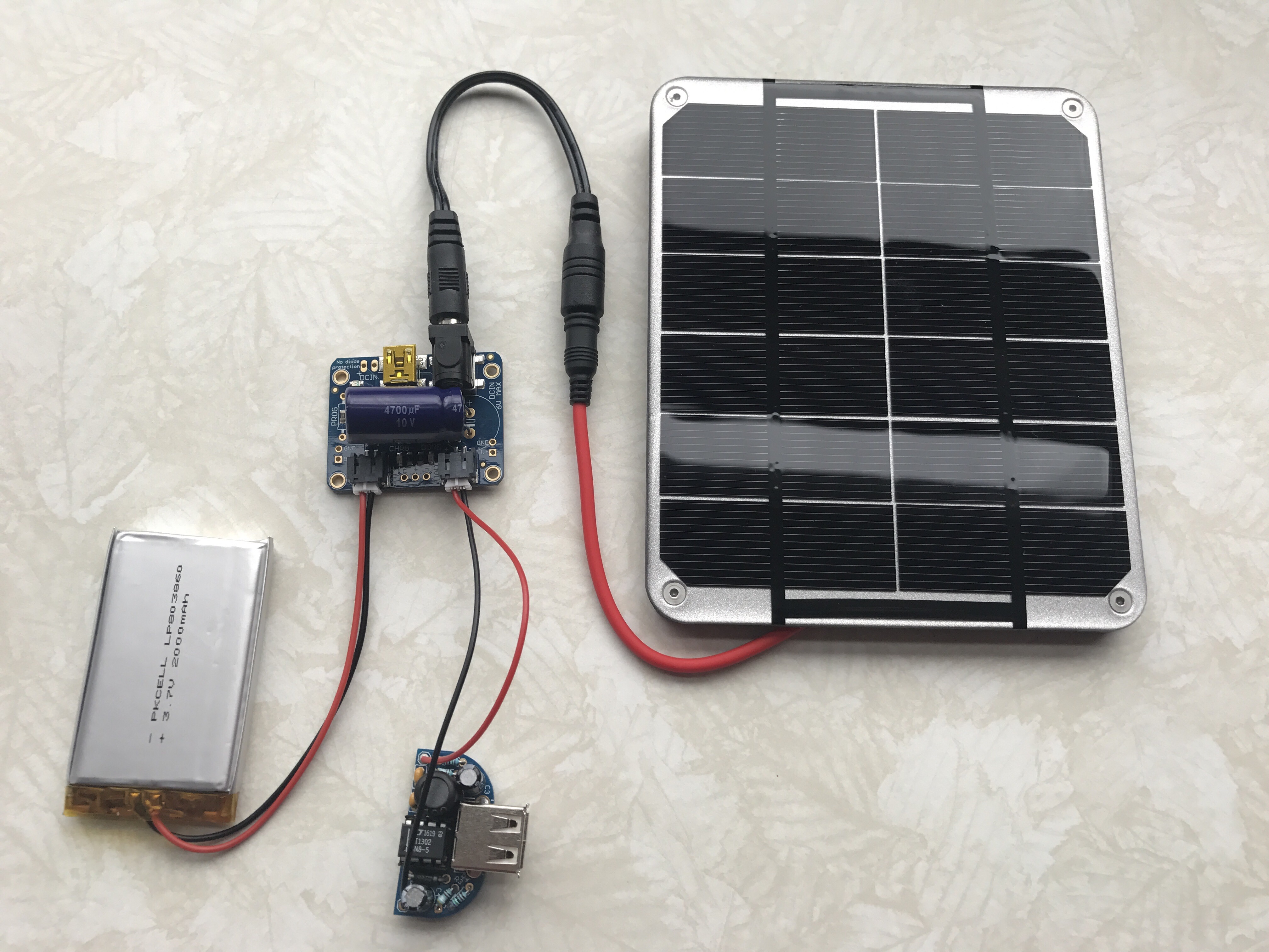 Everything worked great. I can use this little circuit to charge devices over USB (like an iPhone) until I make time to integrate into an actual project. What you see here is a 6V 2W solar panel feeding into a USB/Solar Lithium Ion Polymer Battery charger. It’s charging a 3.7V 2,000mAh Lithium Ion battery. Also connected to the charger is a MintyBoost kit, which takes the 3.7V from the battery and boosts it up to 5V.