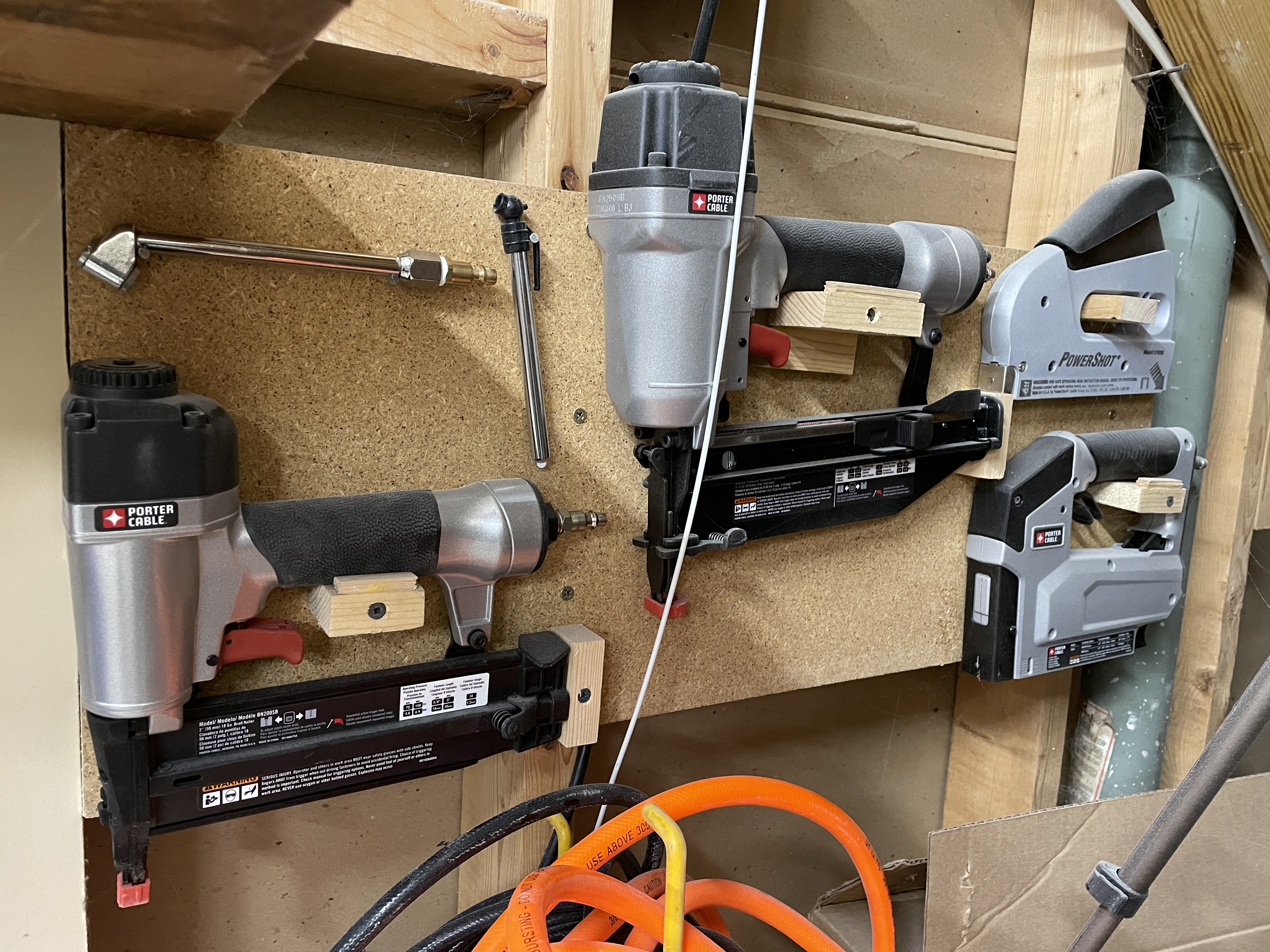 Yesterday I picked up a used 23 gauge pin nailer. I also used a mini die grinder for the first time, which had been sitting on a shelf in the package. Both tools needed places to live, so I made spots on my air tool wall.