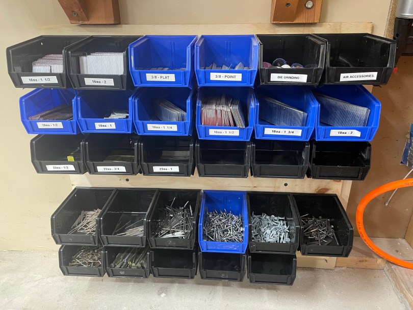 I stopped at Harbor Freight and bought 3 sizes of pins for the new nailer. I also had some unopened boxes of various brad nails sitting around. I took the opportunity to reorganize my bins and more than doubled capacity. Seemed like a good place to move all of the regular nails too.