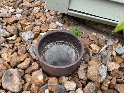 After taking down the sunroom (still a work in progress, which I’ll eventually post about), this pipe for a downspout was no longer needed. I temporarily covered it with a bucket to keep the critters out.