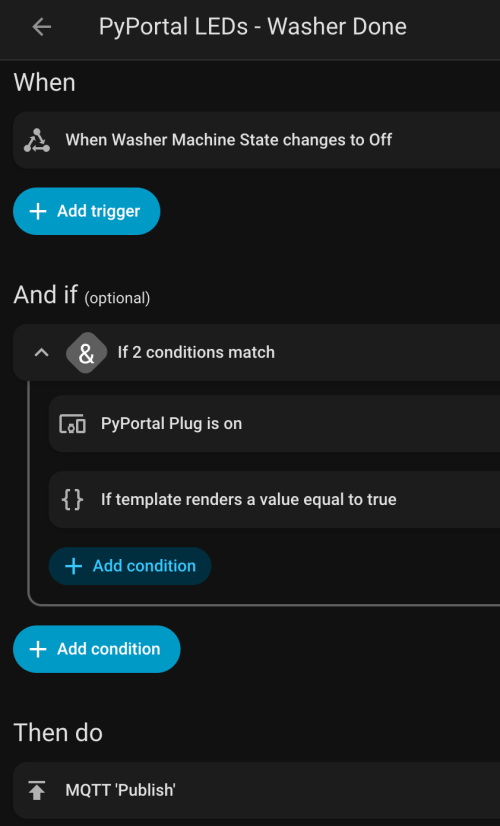 I can manually send these MQTT messages as shown in the demo, but the real power comes from automations. For example, the LEDs automatically pulse blue when the washing machine is done and pink when the dryer is done.