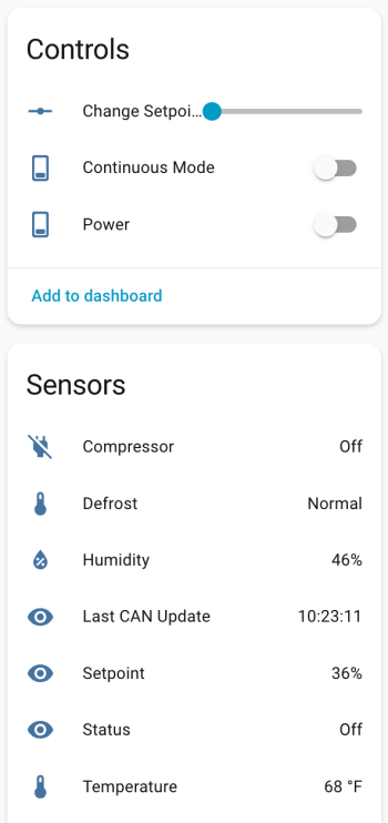 If your ID was different than 0x123 (0x3b0 seems common), change the can_id under on_frame. Update mobile_app_YOUR_PHONE for your phone. Install this new code to the device. Go to Settings -> Devices & services -> ESPHome. If your device isn’t already listed, add it, and click through to see the entities. Hopefully you see the Controls and Sensors with data.