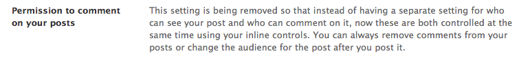 In their latest batch of privacy control changes, Facebook is removing the setting which allowed a user to disable comments on their account. Read about it on their Dig Into the Details page. Here’s a screenshot: