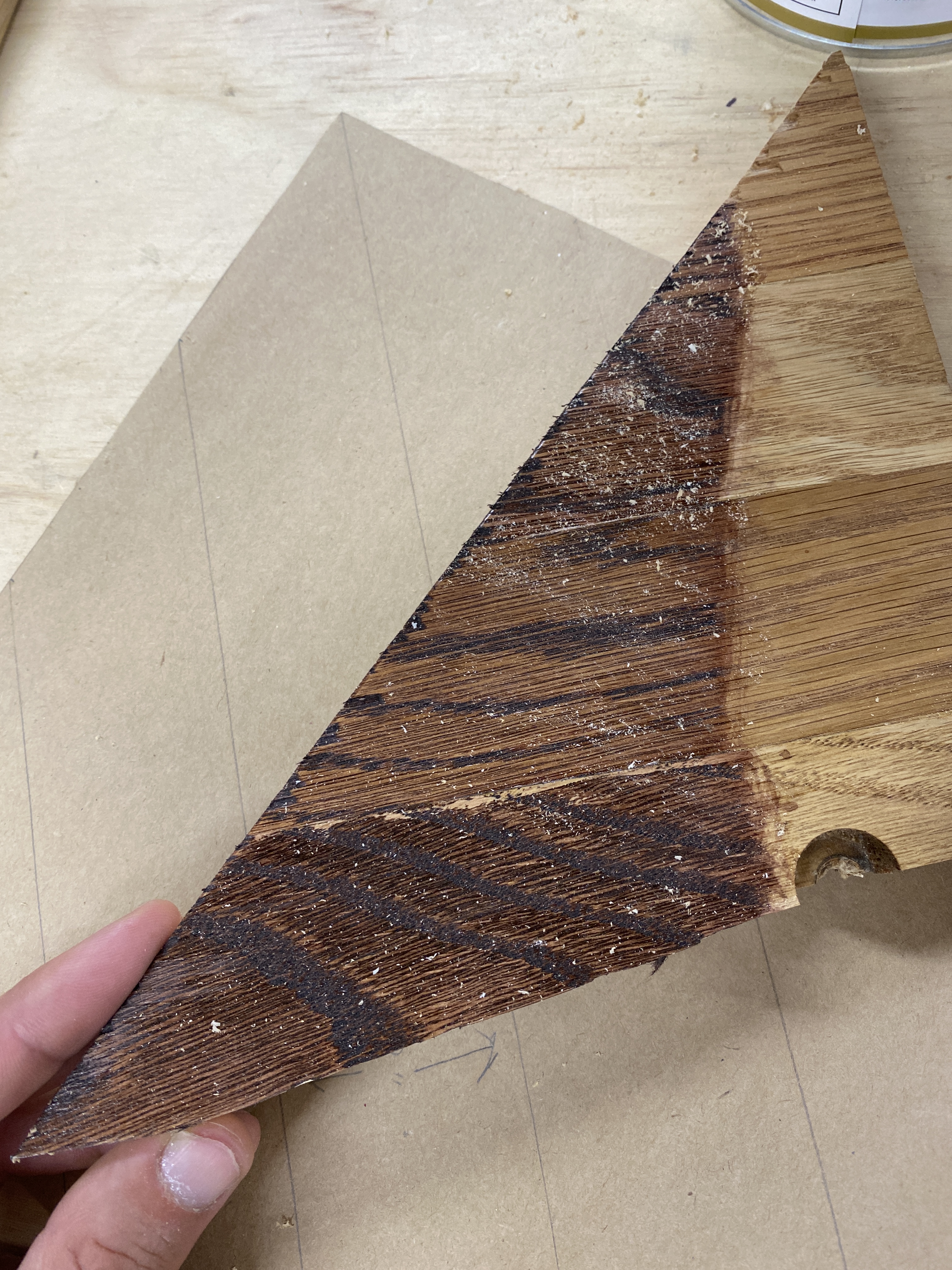Then I worked on what I’m calling the drawer box even though it’s not a box. I also cut top rails from hardboard and oversized drawer faces from walnut. Grabbed strips of walnut for face-framing and glued together pieces of oak to make drawer pulls.