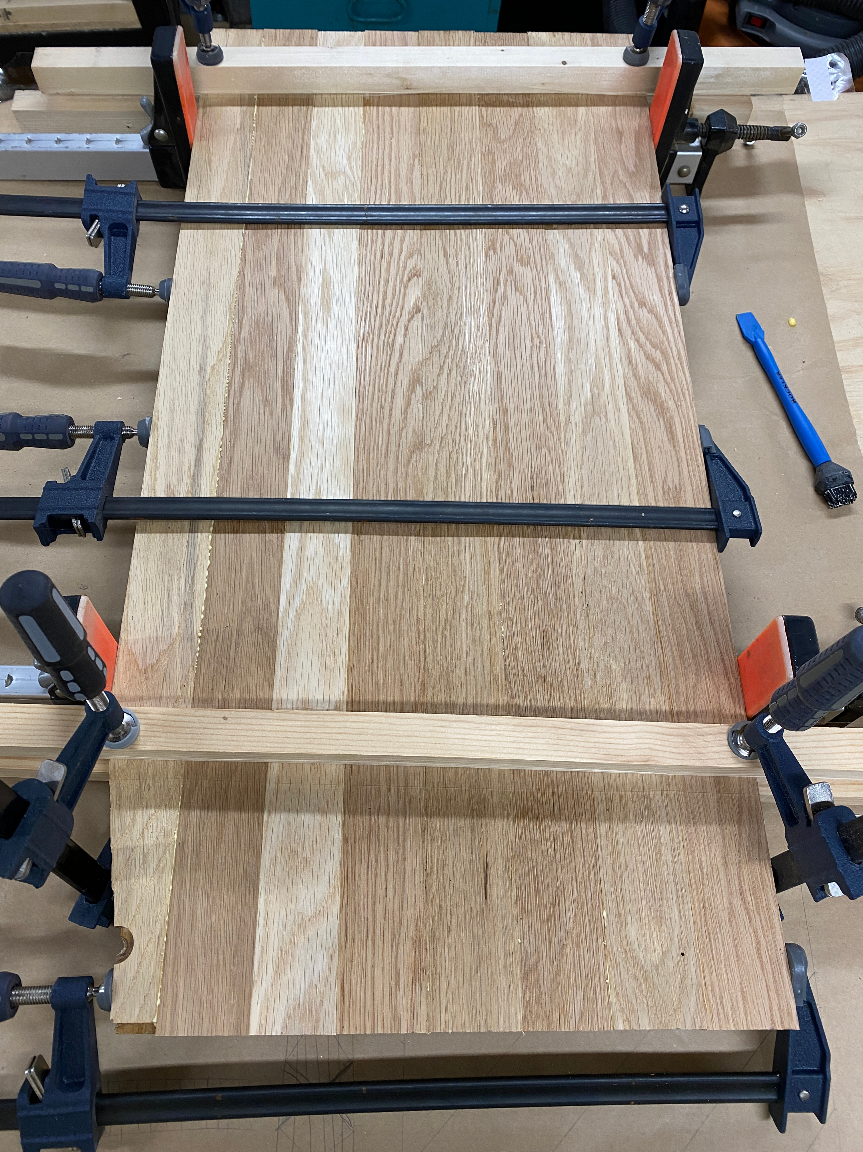 I glued up two sections at a time, which gave me four bigger sections. Then I glued up two of those at a time and one final glue up.