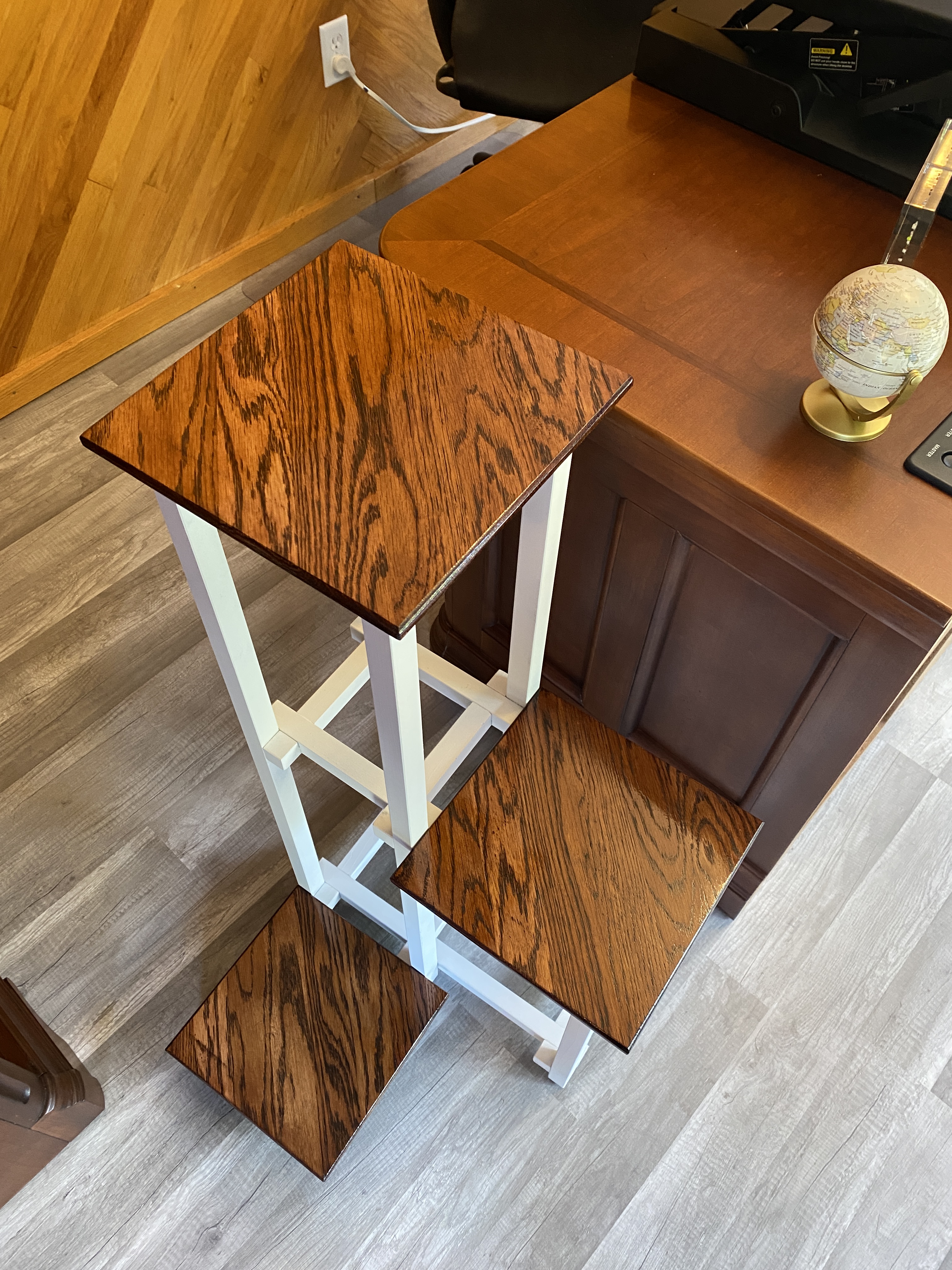 Then it was back to the drawers. I stained the “box” black and ended up having to trim some things to fit better around the rail of the desk base. I sized the drawer faces, made oak handles with 10° angles, assembled everything, and applied finish.
