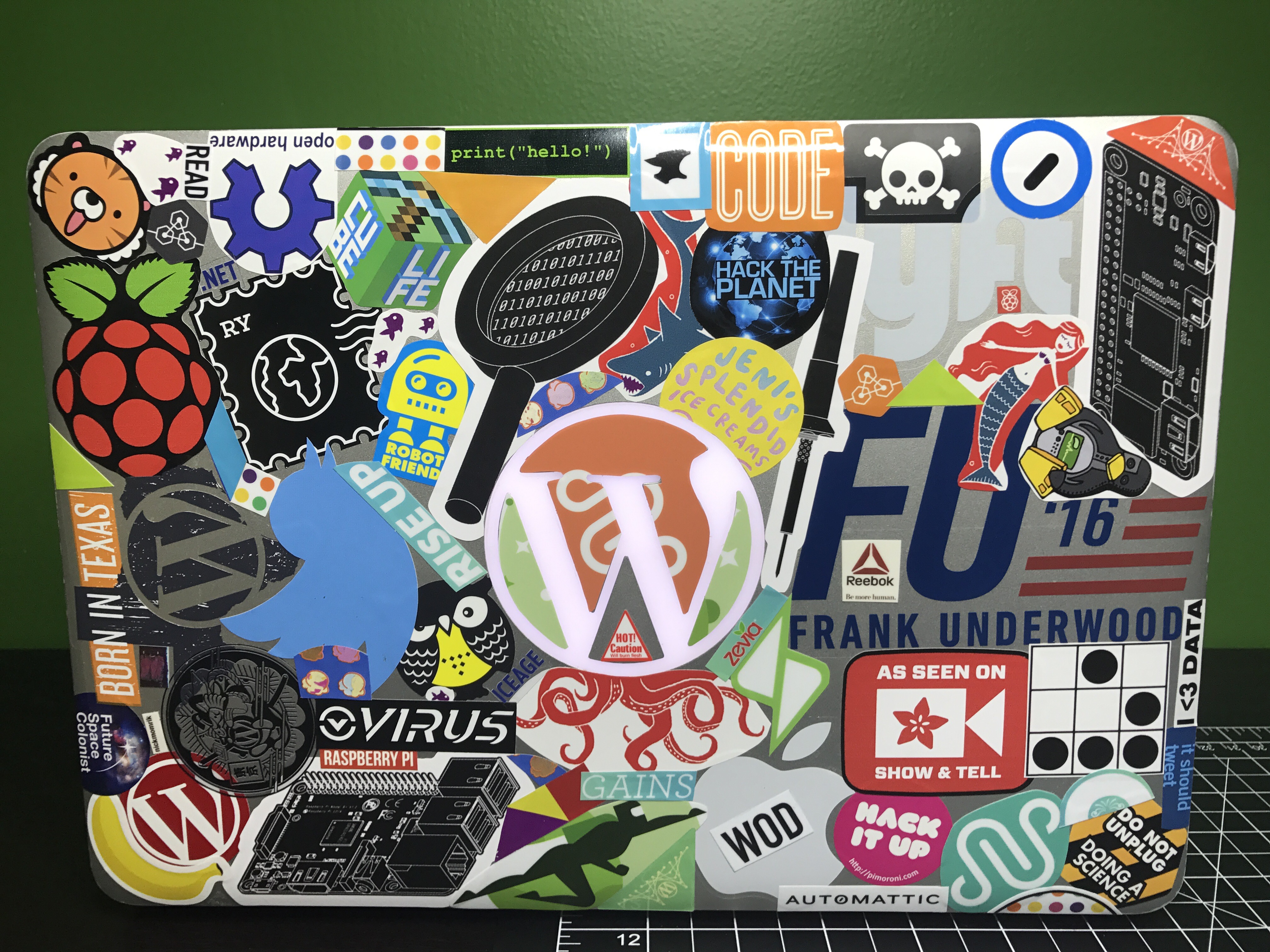 A couple of months ago I started applying stickers to my old 4-year Automatticaversary laptop. After collecting a bunch on recent trips I was able to get the top and bottom pretty well covered. I think my favorites are the Raspberry Pi stickers I bought from the N O D E shop.