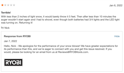 I was extremely disappointed in the machine and due to my positive experience with other Ryobi products, I felt the need to leave an online review, which I almost never do. To my surprise, I got a response the next day.