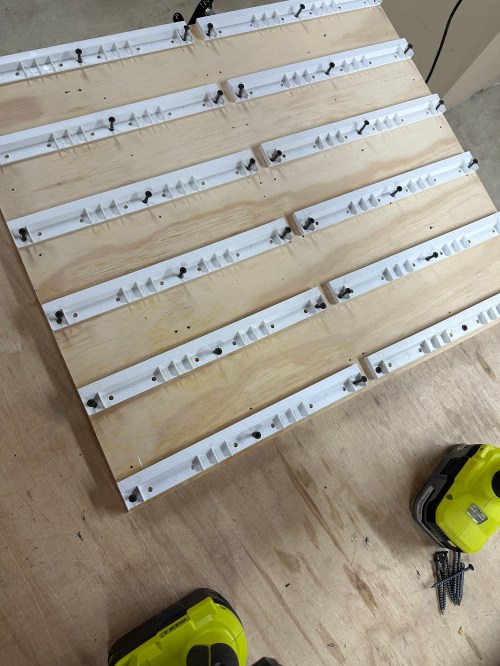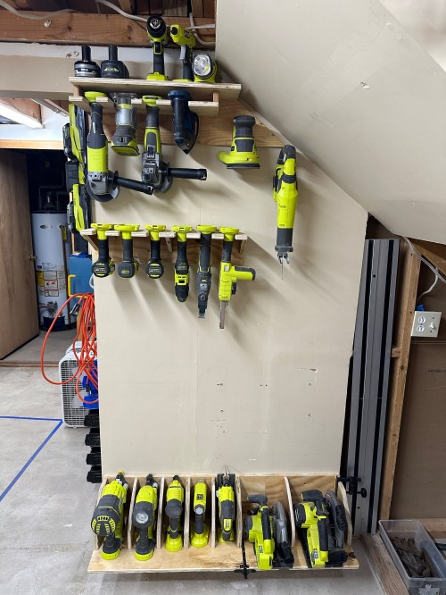 Quick build this weekend to expand my Ryobi tool storage wall (which moved to the new workshop) with spots for the framing nailer I got last year to build the shop wall and a narrow crown stapler I recently bought on sale.